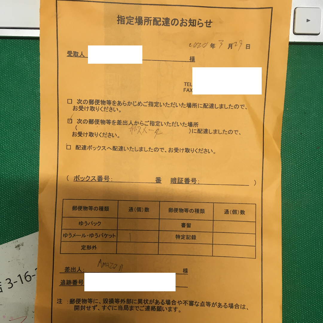でも、恐らく日本郵便は置き配はせずに持ち帰るだろーなと思っていた。