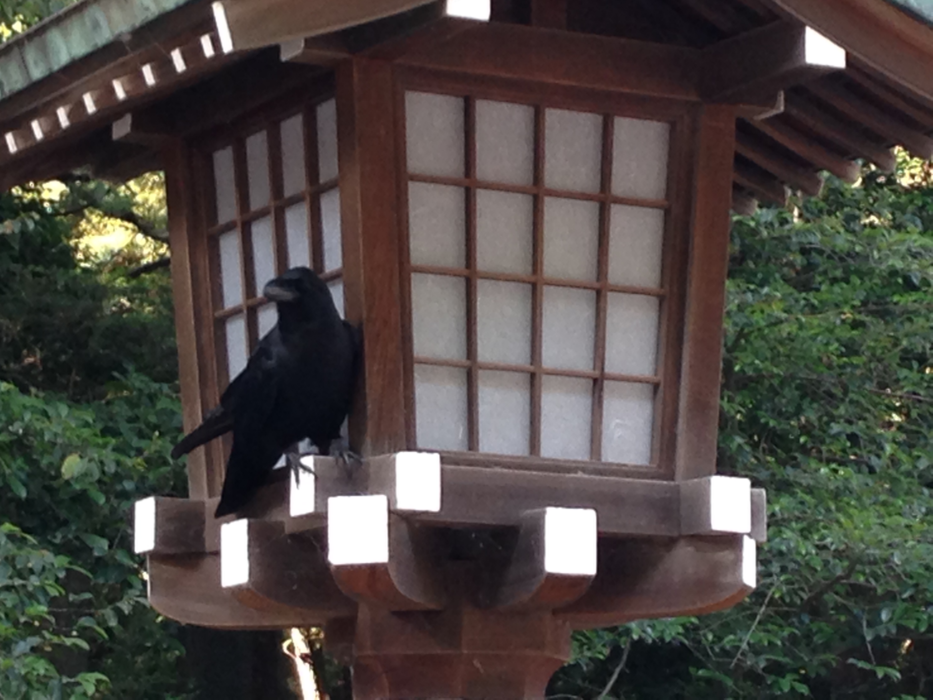 最初、1人の外国人が木の上に留まってたこのカラスを撮影していたのだが、カラスは「もっと撮って」と言わんばかりに前にあった灯籠に移動。