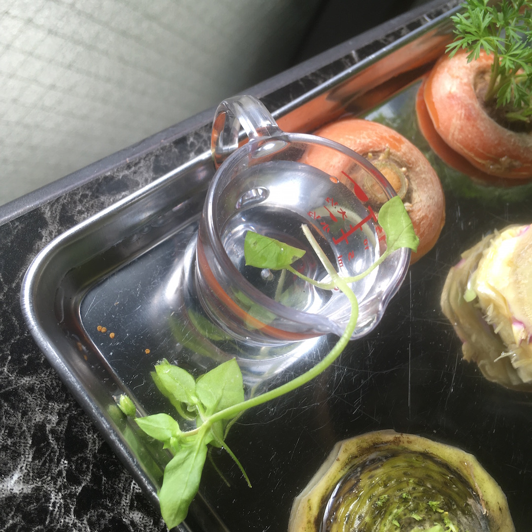 今朝、水を代えてあげて、昼過ぎにふと見るとほうれん草に付いてきたなんだか分からない草が萎れていた。