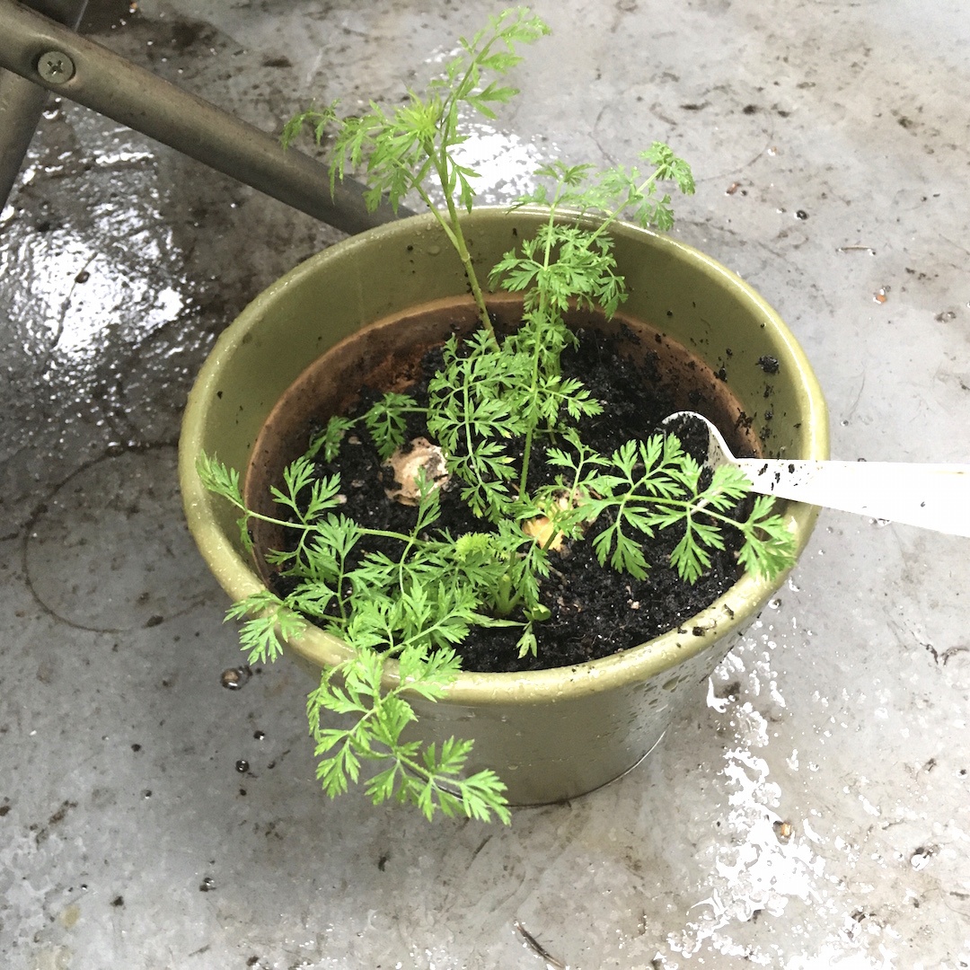 水栽培中のニンジンを鉢に植えてみた。