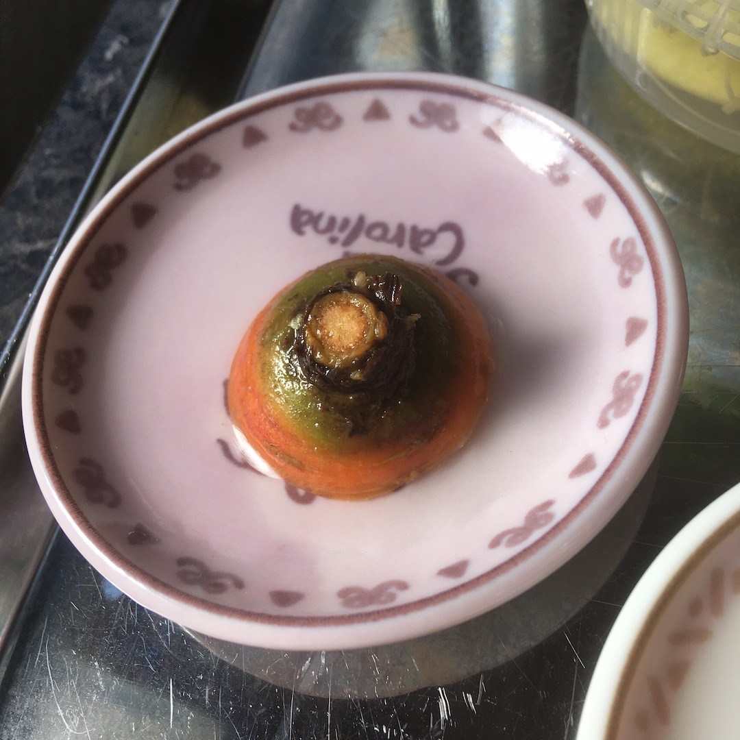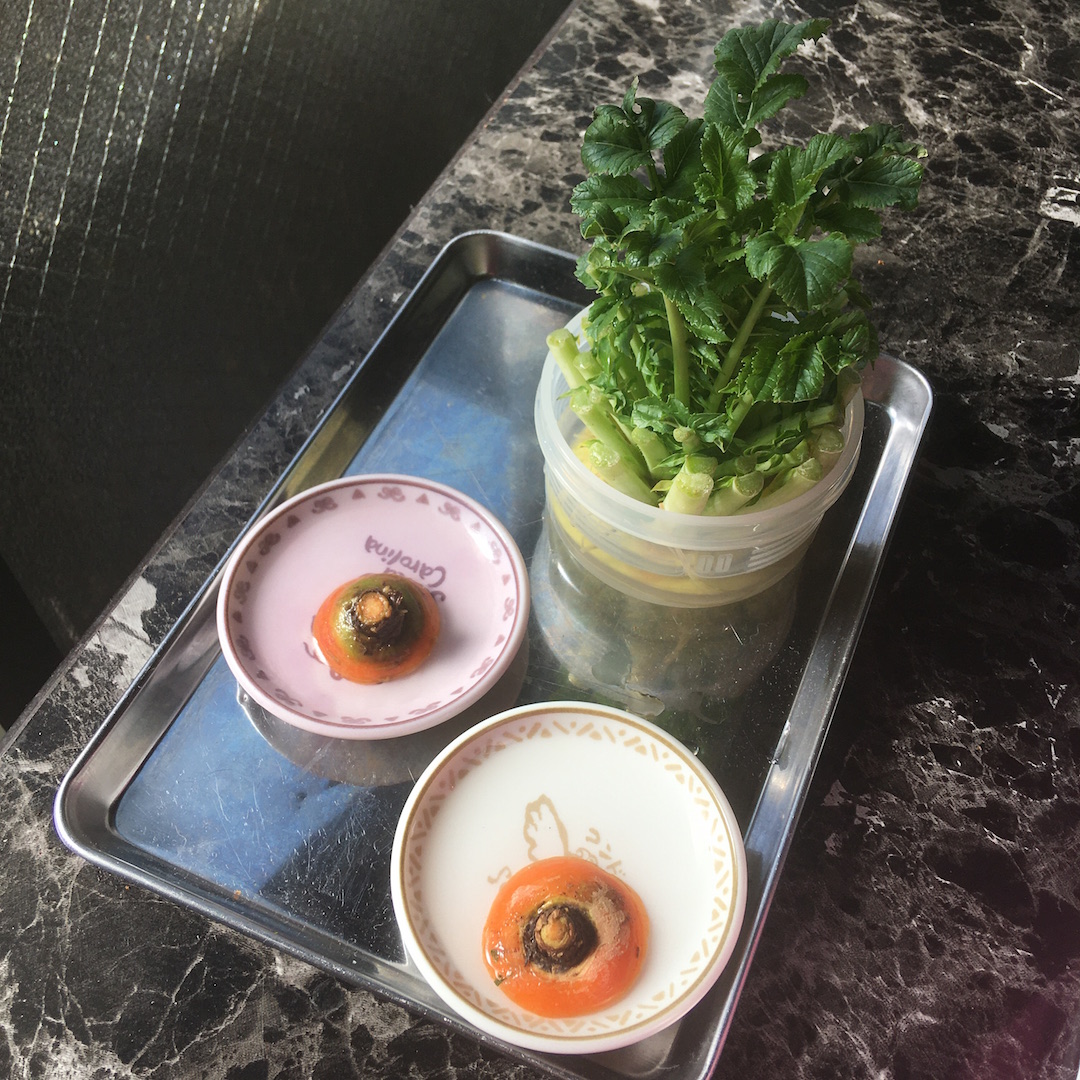 先日購入した大根の切れ端がこんなに育った。 凄いな・・・。 で、人参だけど、左のはもしかしたら芽が出てきたんじゃないかな。 アップにすると・・・。 明らかに始めた時と違うよ。