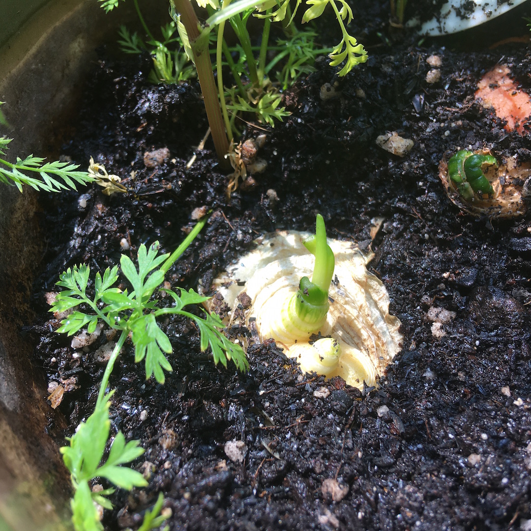 これね、タマネギのヘタてか、根っこ側を切ったのを水栽培してて、根が生えてきたので土に植え替えてみた。