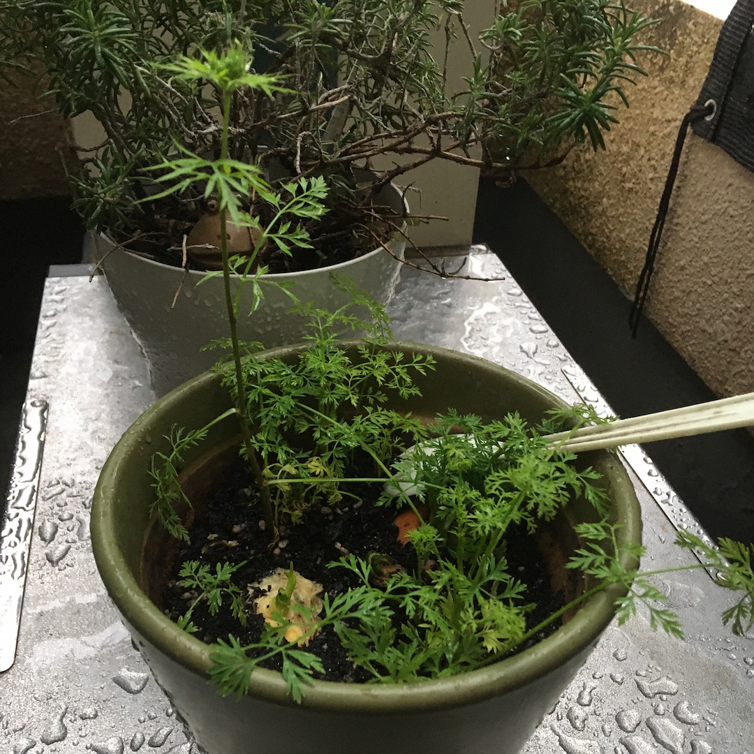 で、この鉢に植えてたニンジンの葉っぱ、形が変だよね(汗)