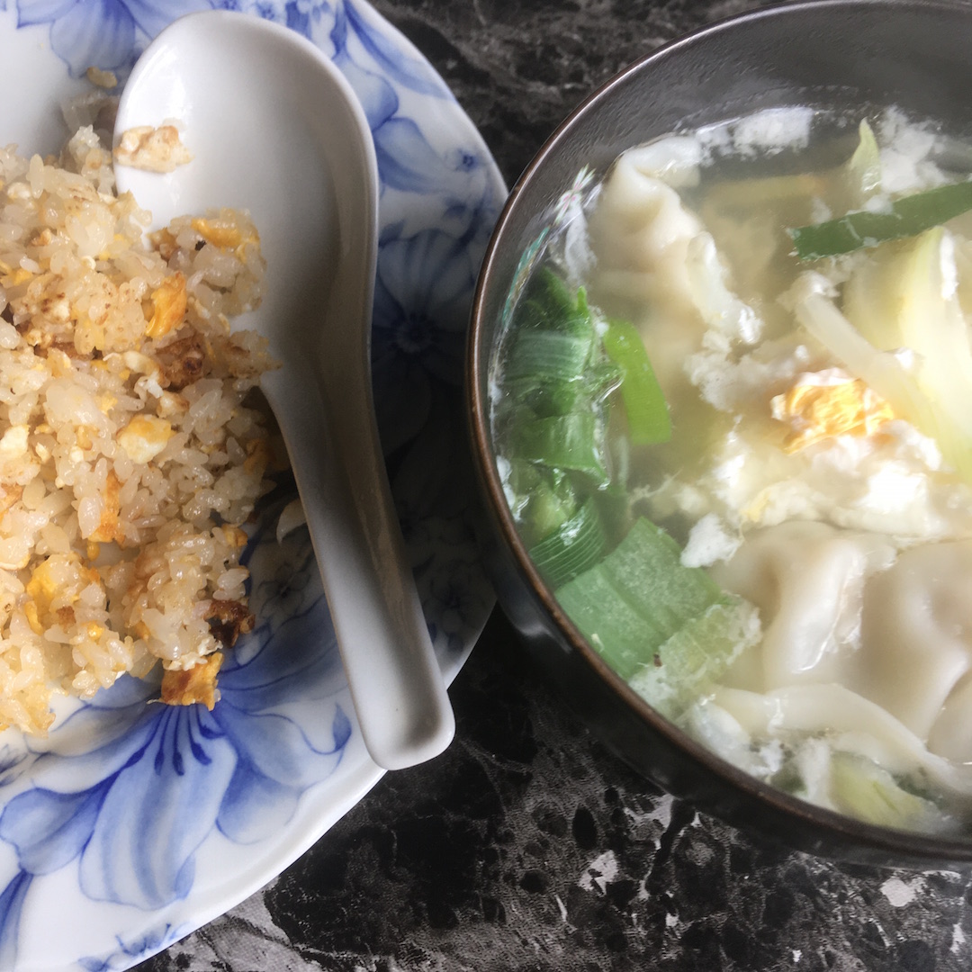 100ローの12個108円の生餃子を前日に焼いて6個食べて、6個余ったのでキャベツやネギを刻んだ中華風スープに入れた。
