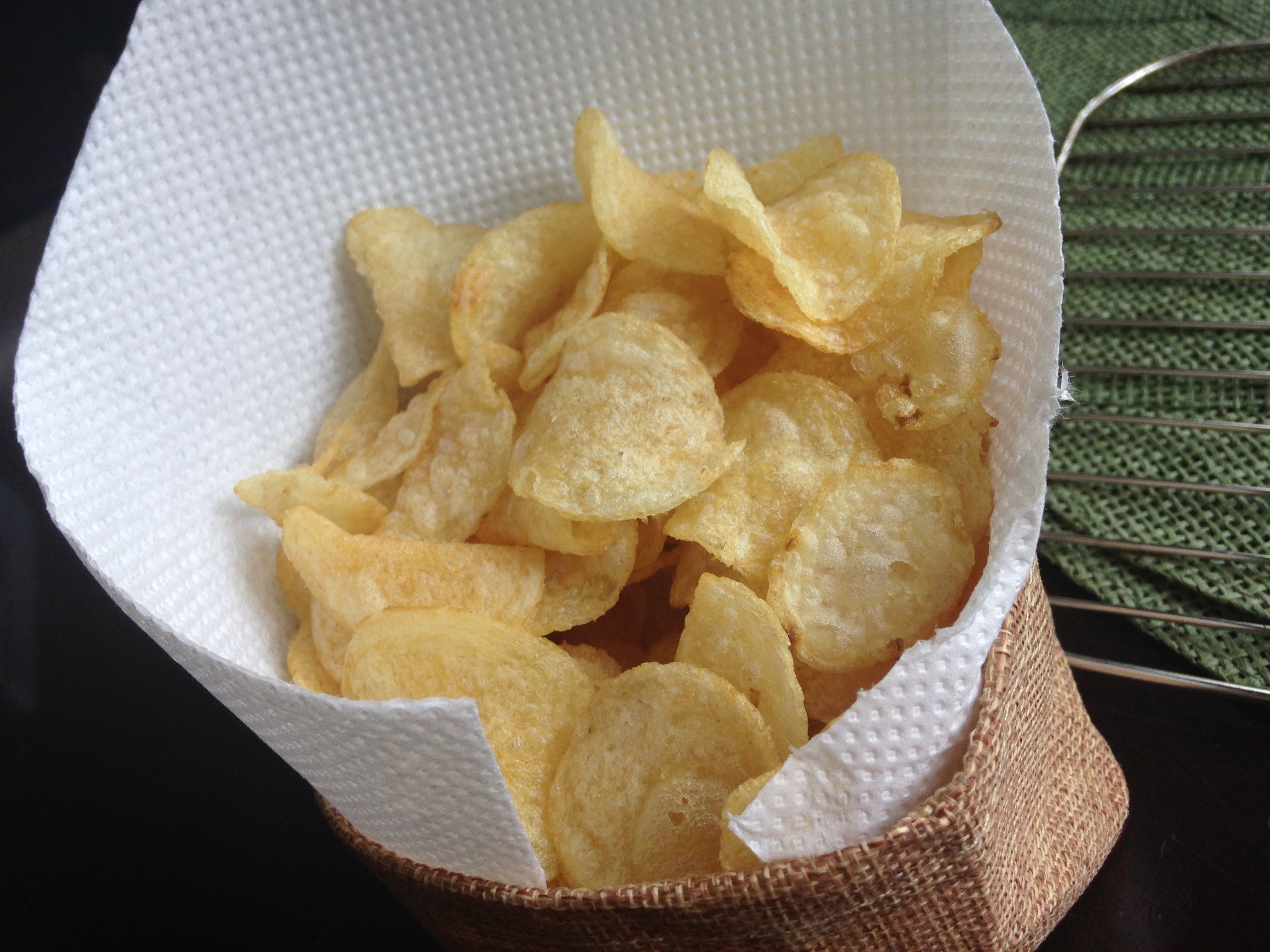 ポテトチップを燻製にする・・・燻す時間は5分くらいで。
