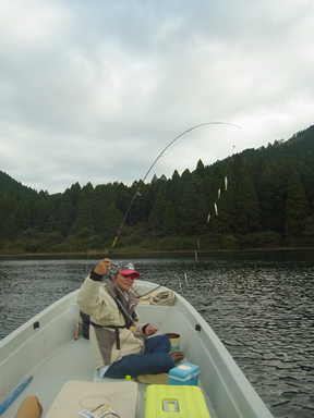 まずは目の前の元箱根湾のいつもの場所で。魚探の反応もイマイチなので、しばらくして一昨日良かった白浜へ移動。白浜の桟橋横14mラインで良い反応があり、形もそこそこ良いのが混じる。ここでアンカーを降ろしてじっくりと釣る。針にかかったワカサギを鱒が狙ってくるので、そうなると針は取られるし、最悪は仕掛けを切られてしまう。2~3度鱒の攻撃にあい仕掛けを取られた。