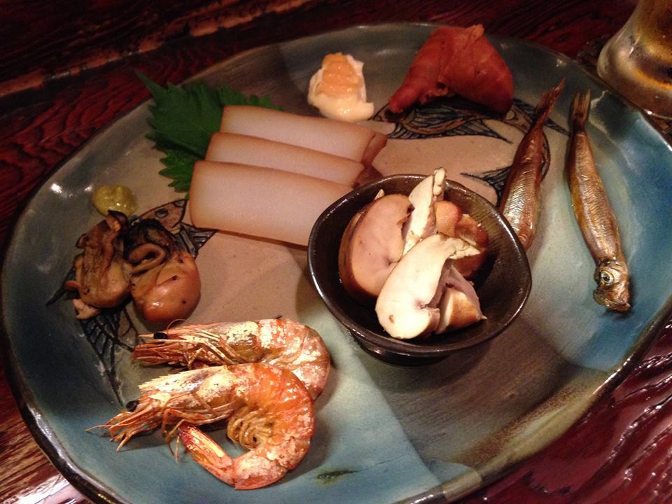 左から、牡蛎・イカ・マヨネーズの燻製・タラコ・シシャモ・秋鮭白子・エビ・・・痛風の人にはタマラナイセットでしょうか。