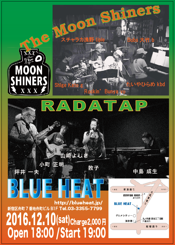 12月のライブ、10日土曜はBLUE HEATです。 RADATAPフルメンバーです。 タイバンはブラックミュージック評論家文屋章氏率いるThe Moon Shiners。 土曜ですので19時スタートです。 そして、17日土曜は国分寺giee。 タイトルの通り、忘年会の雰囲気だそうです。 18時オープン・18時30分のスタートで、RADATAP Duoは確かラストの出演のようです。 オオトリではなく単なる年功序列かと・・・永田さん、Kogu以外は初顔合わせになります。
