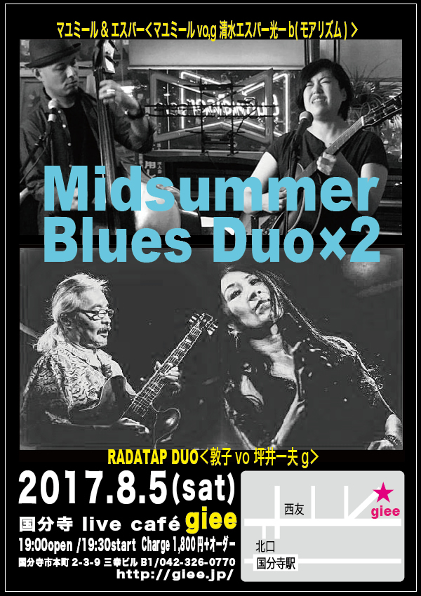 8月5日(土曜)は国分寺gieeです。 19時オープン・19時30分スタートです。 Midsummer Blues Duo x 2というタイトルです。 タイバンはマユミール&エスパーさん。