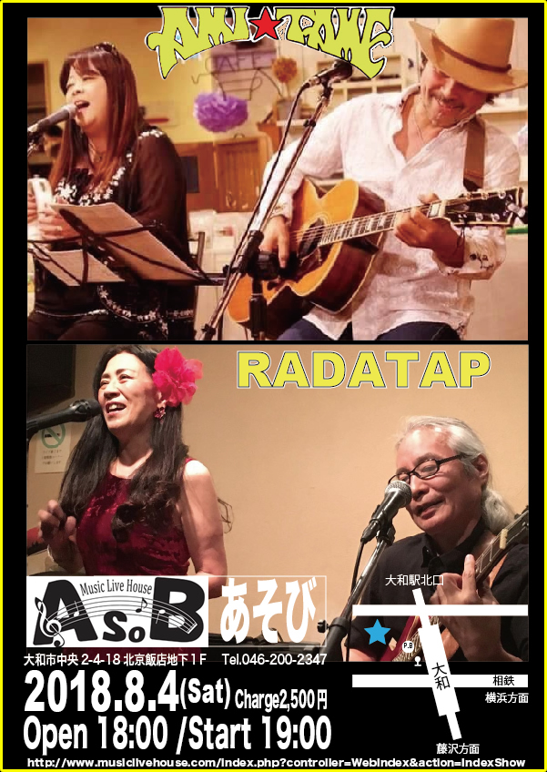 今宵は大和AsoBでRADATAP Duoのライブです。 大和AsoBは初めてライブを演らせていただきます。 共演させていただくのは アミタメさんのお2人。 以前からDuoで活動されているのを知ってはいたのですが、最近に初めて演奏をYouTubeで拝見。 素晴らしいの一言・・・選曲・演奏・運び・・・我々とはタイプも違うのですが、とても刺激になり、勉強にもなりますね。 素晴らしいDuoです。 AsoB大和駅から徒歩3分位でしょうか。 是非、ご来場ください。