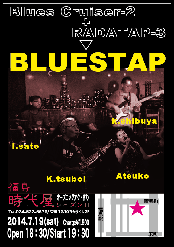 昨年はRADATAP全員でお世話になりましたが、今回7月19日は東北No.1ブルースバンドのブルースクルーザーからベースしぶけん渋谷研一さん、同じくブルースクルーザーのドラム佐藤勇さんと4人の初ユニットでライブです。