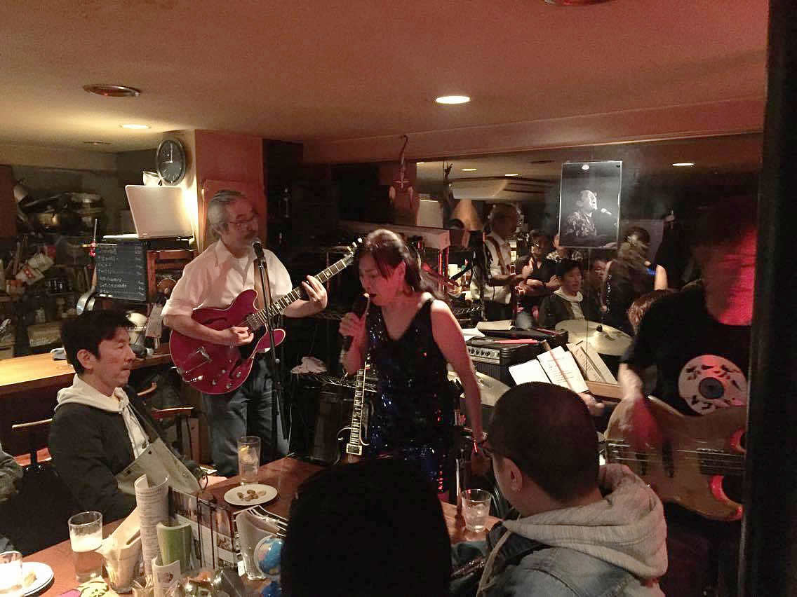 ヴォーカル敦子が「我が心のジョージア」のイントロで高田の写真を振り返り見上げてる図。