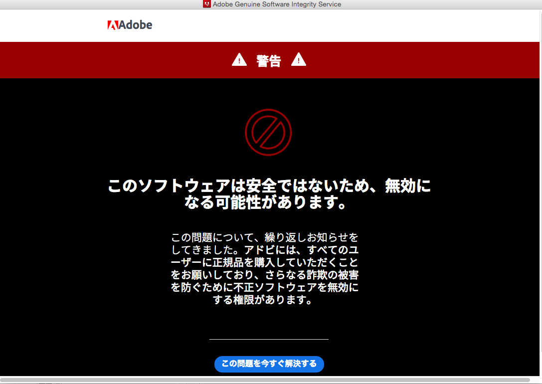 たしか以前にも書いた気がするが、正規品なのにAdobe社のアプリケーションを起動すると以下のようなアラートが出る。